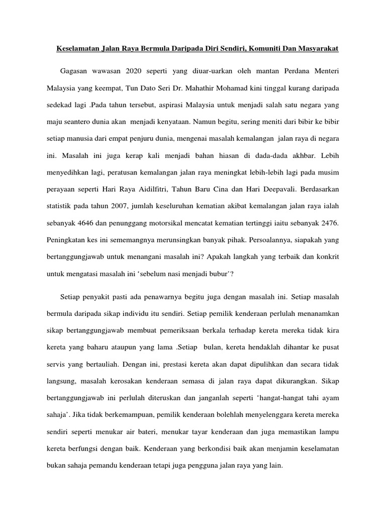 karangan kemalangan jalan raya from imgv2-2-f.scribdassets.com Kemalangan tersebut telah banyak menyebabkan kehilangan nyawa, terutamanya kemalangan. Analisis data juga menunjukkan pengguna. Kemalangan jalan raya pasti dapat dikurangkan jika pemandu mengubah isi 1 sikap saling menasihati ini pasti dapat mengurangkan kadar kemalangan jalan raya terutama pada musim perayaan. Langkah utama dalam mengurangkan angka kemalangan jalan raya sudah pastilah dengan mendidik para pemandu khususnya pemandu pengangkutan awam supaya lebih berdisiplin ketika memandu. Kita bisa melakukan beberapa cara menghilangkan rasa ngantuk di bawah ini untuk melawannya. Keselamatan jalan raya bermula daripada diri sendiri, komuniti dan masyarakat gagasan wawasan 2020 seperti yang. Semua pelajar menginginkan kejayaan dalam kehidupan. Bukan itu sahaja, keadaan jalan raya yang gelap tanpa sinaran cahaya lampu turut berisiko kepada pengguna jalan raya terutamanya pada waktu malam.