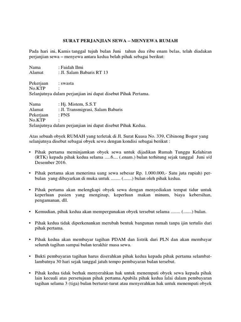 Sebelum melihat contoh perjanjian sewa rumah yang benar, perlu diketahui dalam proses pembuatannya perjanjian sewa rumah terdapat beberapa syarat sah yang harus kamu penuhi, di antaranya: Berikut merupakan intipati yang perlu ada di dalam surat ini. Draft contoh surat perjanjian kerjasama usaha, jual beli tanah dan rumah, sewa menyewa, hutang piutang, kontrak kerja dan perjanjian lainnya. Kemudian datang 2 bakal penyewa yang mahu sewa rumah tersebut. Contoh perjanjian sewa menyewa , baik itu perjanjian sewa rumah, sewa mobil, sewa alat berat maupun perjanjian sewa menyewa barang lain.