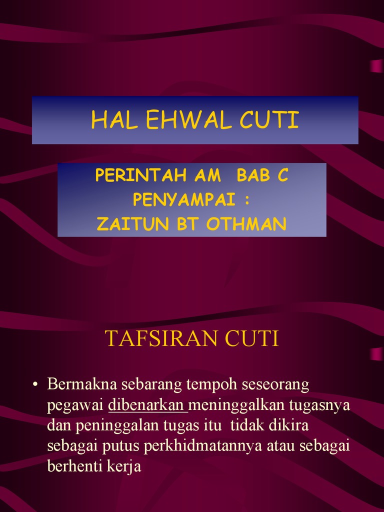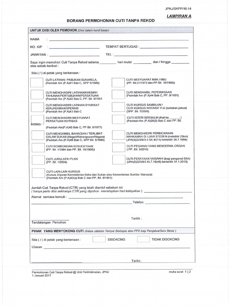 Cuti mengambil bahagian dalam olahraga/sukan. Cuma anda masih lagi tak berani nak berhenti kerja. Bermula tahun ini, pegawai perkhidmatan awam beragama hindu diberikan kemudahan cuti tanpa rekod selama satu hari, sehari selepas cuti umum hari deepavali. Cuti menghadiri mesyuarat persatuan ikhtisas. Pekeliling kelayakan cuti tanpa rekod guru sebagai penjawat awam layanlah berita terkini tips berguna maklumat. Jika cuti rehat telah kehabisan, boleh diberi cuti tanpa gaji. X tahu nk prepare apa? Cuti menghadiri perbicaraan mahkamah di luar stesen. Ini temuduga untuk kerja paling sukar dalam dunia. Cuti untuk mengambil peperiksaan (nyatakan): Boleh diberi kepada staf yang memasuki peperiksaan yang dianggap oleh ketua jabatan sebagai boleh membaiki peluang hidup atau peningkatan kerjaya.(pa 44 bab c) 2. Cuti menghadiri latihan syarikat kerjasama. Jika anda belum tahu semua, jangan khawatir.