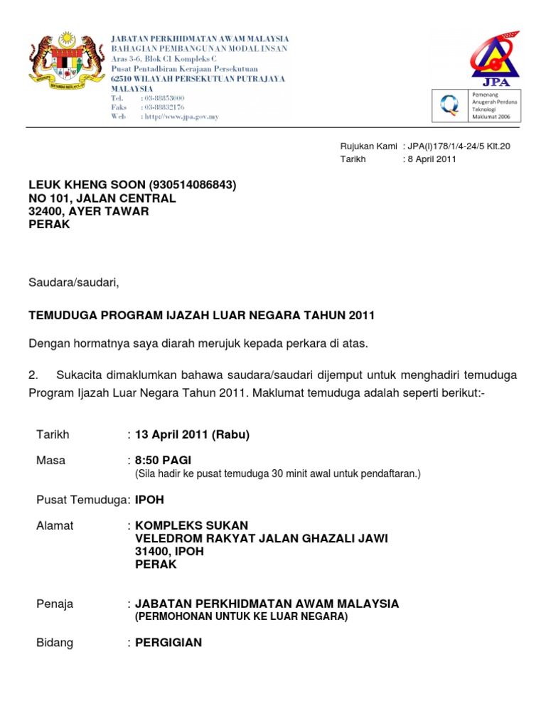 Membuat permohonan cuti tanpa rekod pada tahun semasa : Kerajaan telah meluluskan hak untuk mengambil cuti tanpa rekod buat penjawat awam sama ada islam mahupun bukan islam atas alasan keagamaan, kata menteri kewangan, lim guan eng. Surat panggilan temuduga bagi 930514086843. Surat berkenaan dikeluarkan untuk perhatian ketua setiausaha kementerian, ketua jabatan persekutuan. Sesiapa pun yang menghadiri sesi temuduga tidak akan terkecuali daripada perasaan takut dan gementar.