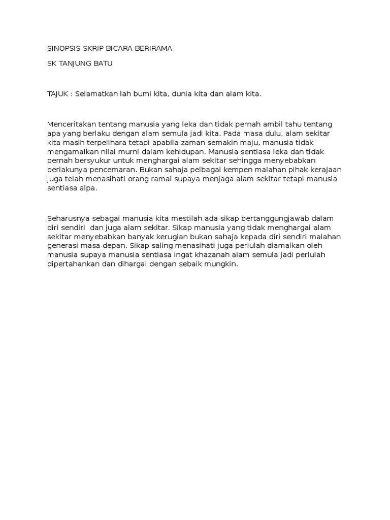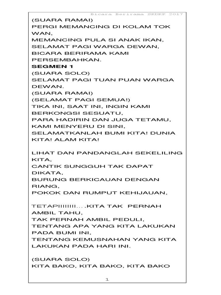 Doc Skrip Bicara Berirama Bahasa Penyatu Bangsa Mendukung Transformasi 1malaysia Siti Halimah Academia Edu from 0.academia-photos.com Skrip terbaik bicara berirama peringkat kebangsaan 2018 kontingen negeri melaka smk seri tanjong. Skrip terbaik bicara berirama peringkat kebangsaan 2018 kontingen negeri melaka smk seri tanjong. Alam sekitar di negara kita didapati semakin tercemar. Setiap individu dan rakyat di negara ini perlulah memainkan peranan penting. Seharusnya sebagai manusia kita mestilah ada sikap bertanggungjawab dalam diri sendiri dan juga alam sekitar. Sambil diputar putar kadang supaya diremas kecil. Dengan alam juga mereka dapat hidup hingga saat ini yang tentunya telah melalui banyak perubahan, seperti perubahan penggunaan lahan, perubahan penggunaan air dan lain sebagainya. Johan bicara berirama daerah kauantan 2018.